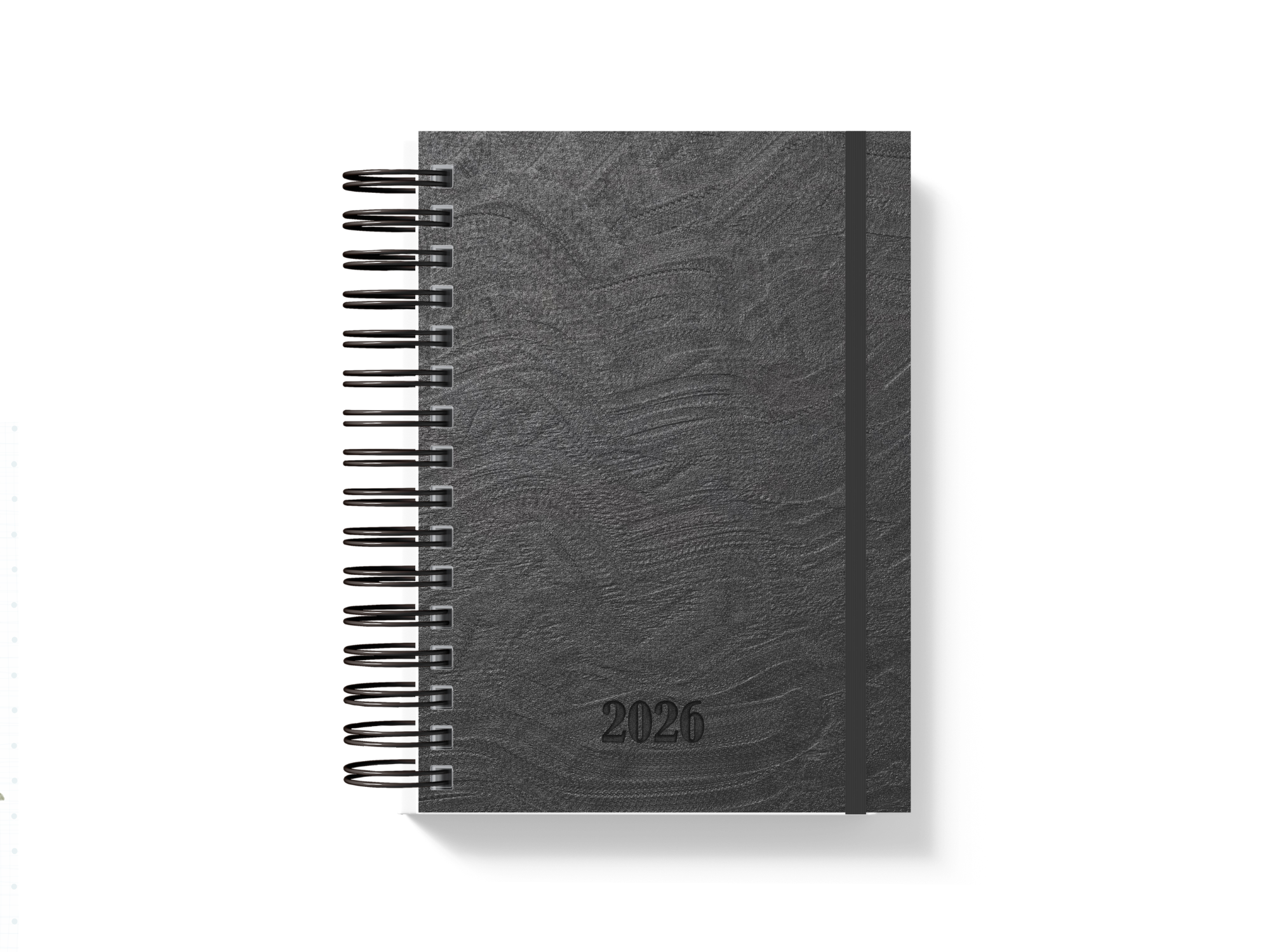 - Agenda 2026 (2 dias por página): Tamanho A5 (15,5 x 21,5cm), 113 folhas 90g impressas (dados pessoais, calendários 26 e 27, planejamento anual, metas e planos de ação, cuidados com a saúde, logins e senhas) envelope plástico canguru, capa dura laminada, wire-o e fechamento em elástico. Acompanha régua marca-página.